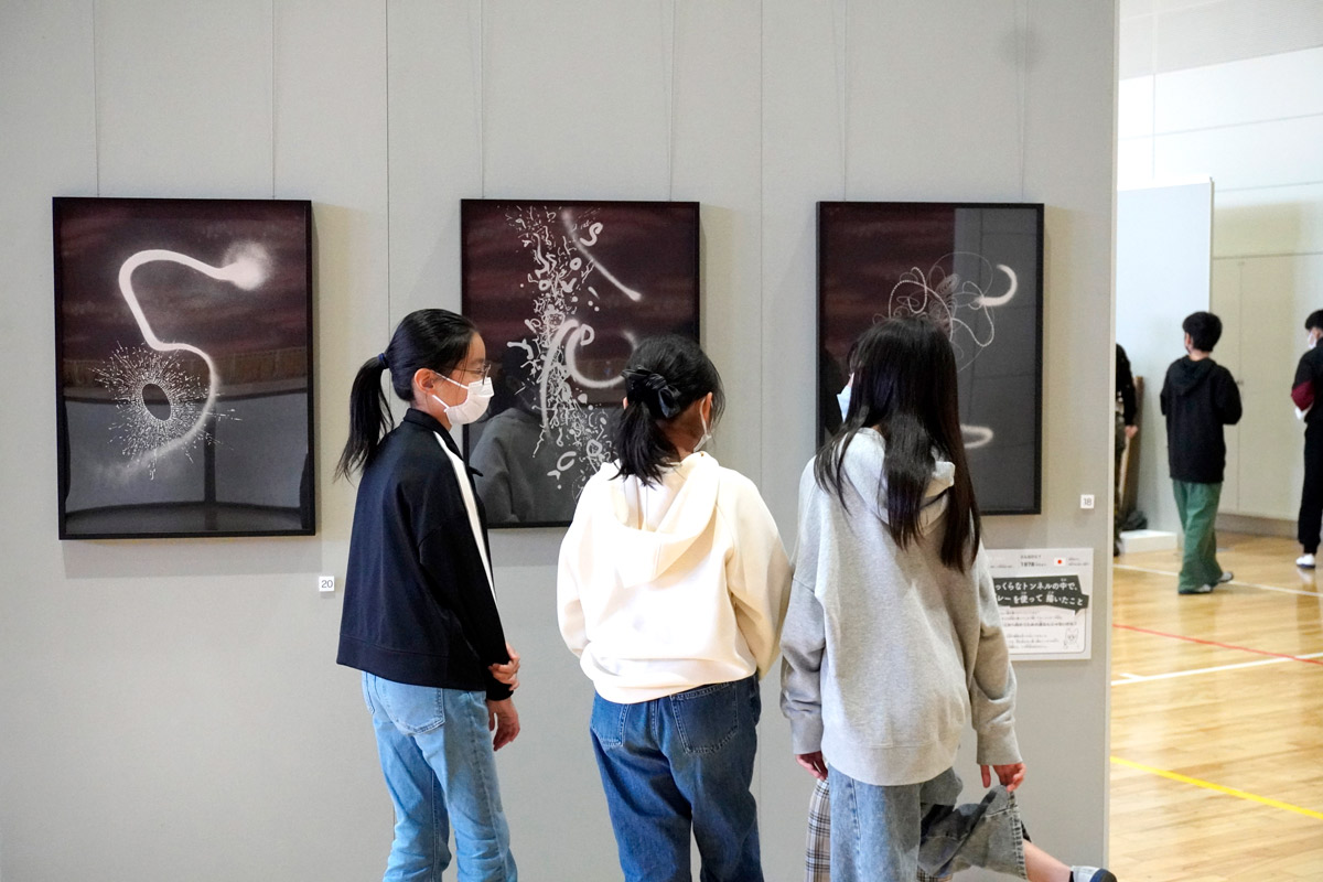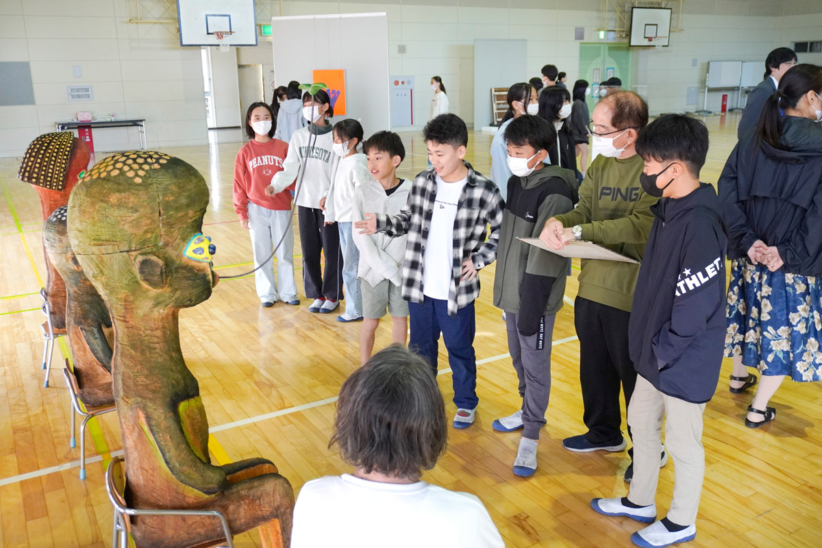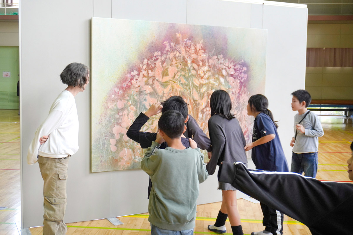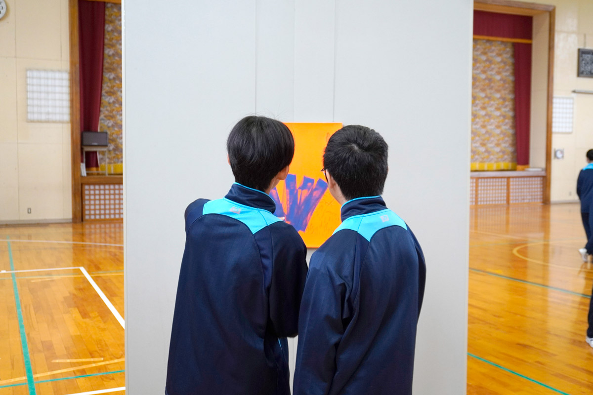 小学校・中学校ともに体育館はとても広く、子どもたちが自由み見て回るには十分な空間で、私たちスタッフもどんな展覧会になるかとてもワクワクしていました。