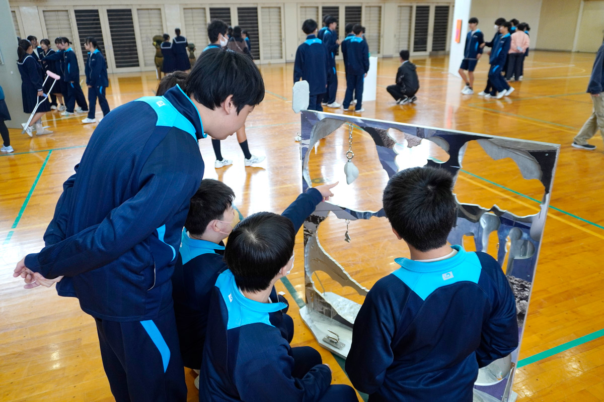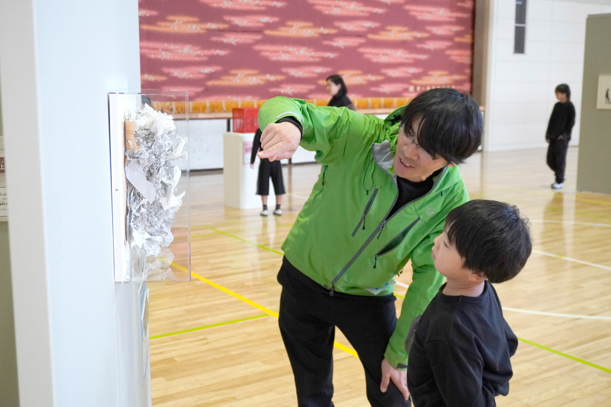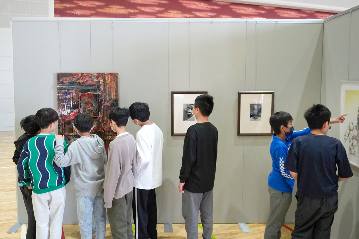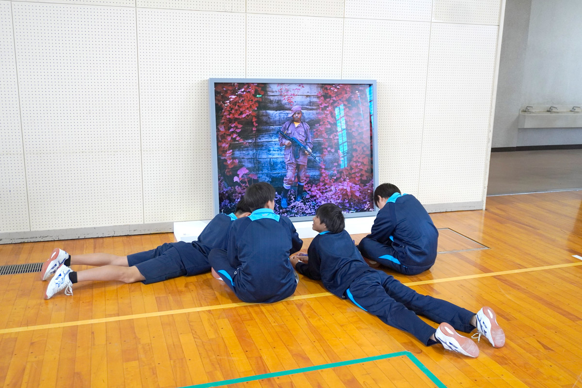 小学校・中学校ともに体育館はとても広く、子どもたちが自由み見て回るには十分な空間で、私たちスタッフもどんな展覧会になるかとてもワクワクしていました。