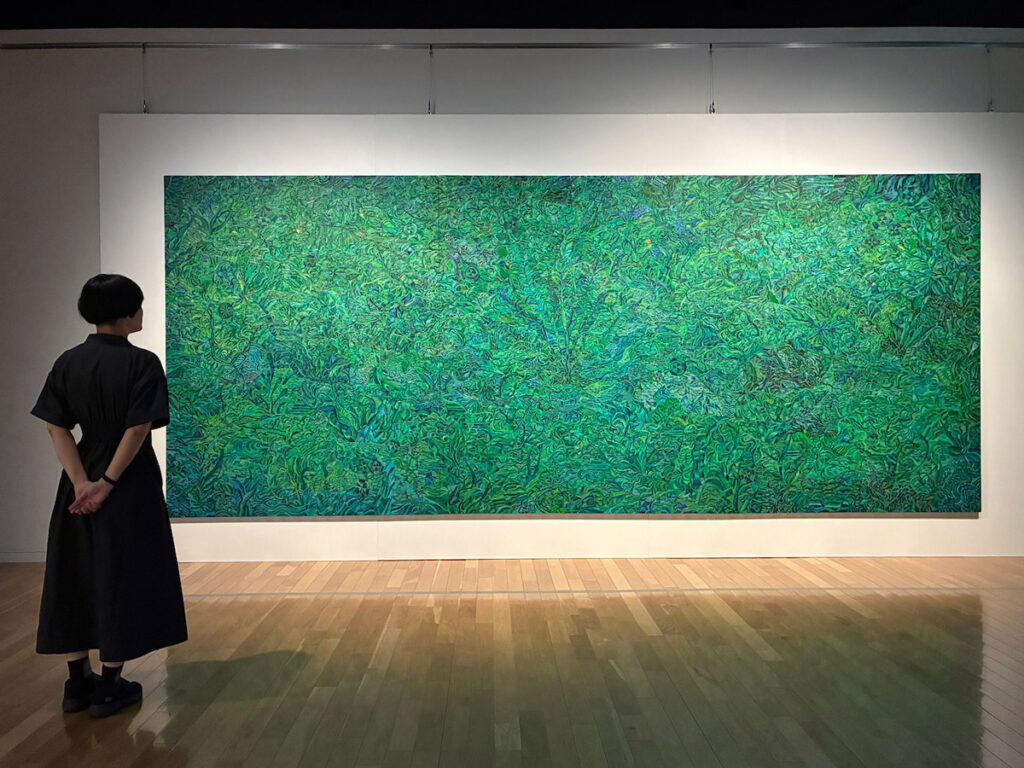 ミネバネ!展で展示した坂本和也さんの作品《Landscape gardening》(2014年)は、縦2m×横5mを超える大作です。水草の栽培や植物を育てる行為と絵画表現を往還しながら、制作を続ける坂本さんの作品には、自然と人の営みが交差する地点を静かに見つめるまなざしが宿っているかのようです。