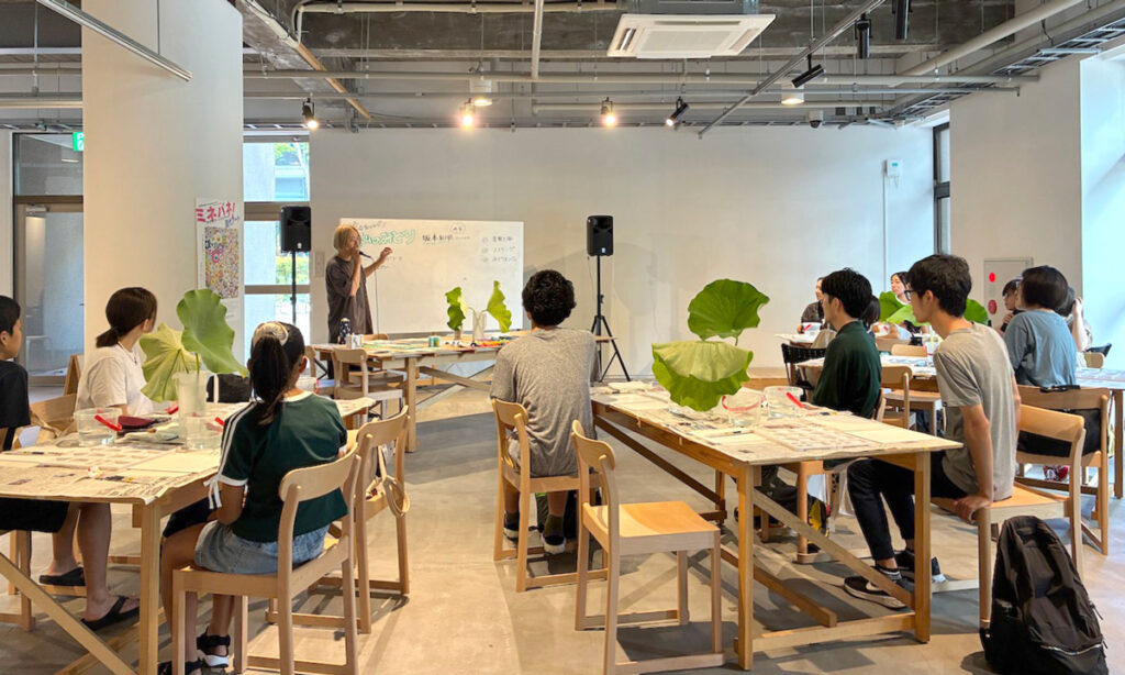 参加者それぞれが葉を選び、葉脈の形や太さ、伸びる方向を丁寧にスケッチしていきます。「蓮の葉って、こんなかたちだったっけ!?」「葉脈までじっくり見たことなかった」など、観察を通して“見る”ことの解像度が上がっていきます。