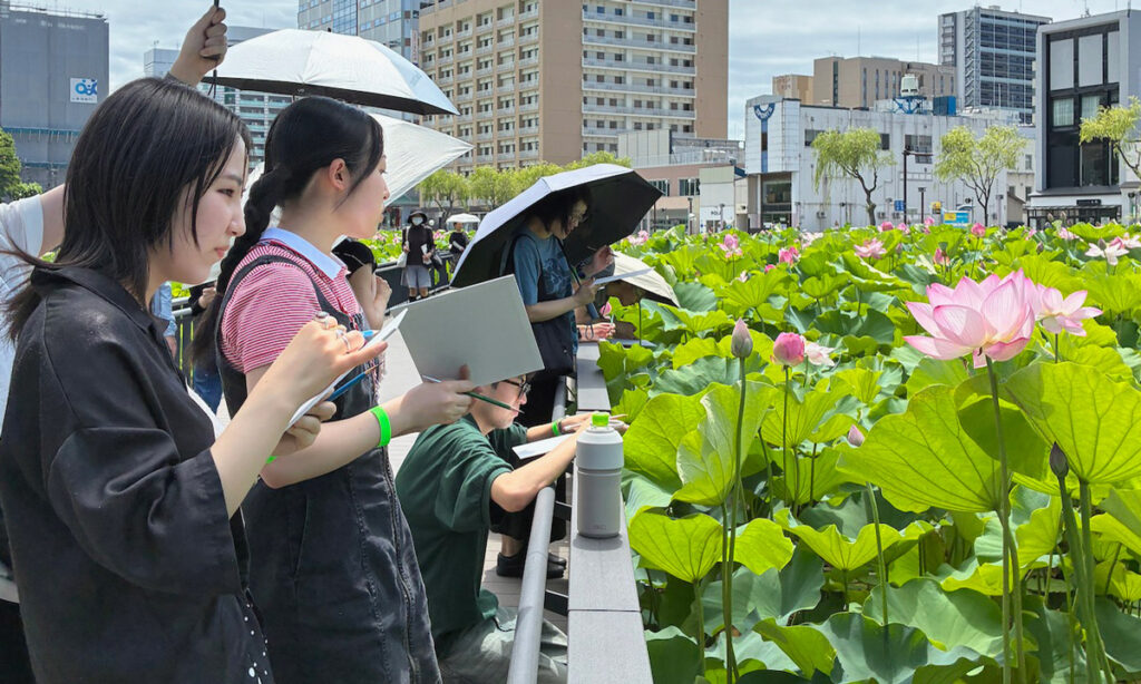 今回のワークショップでは、坂本さんの制作の起点ともいえる自然との関わりを取り入れ、ちょうど見頃を迎えたお堀の蓮を観察する、秋田ならではのフィールドワークからスタート。