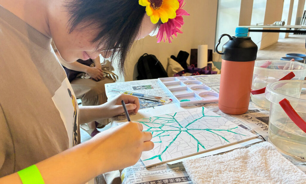 館内に戻ったら、スケッチをもとにマスキング液で葉脈を描きます。マスキングとは“覆い隠す”という意味。少し粘り気のある液状のマスキング液で鉛筆の線をなぞると、キャンバスのほかの部分に色を塗ってもその部分が白く残ります。普段使い慣れない素材で、太さの調整に苦戦しながらも、集中して線を描きました。