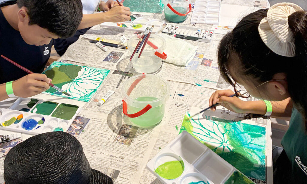 同じ「みどり」でも、人それぞれイメージはさまざまです。観察した蓮の葉の緑をそのまま表現するのか、それとも印象やその日の気分を色で表すのか。参加者は自分と対話しながら、「私のみどり」を探り、絵の具の黄色やピンク、赤などからを選んでいきます。